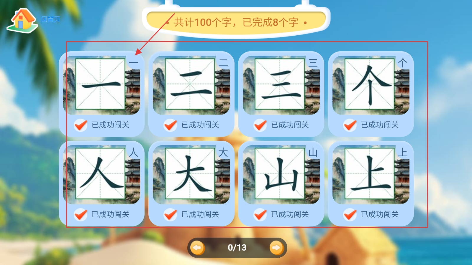 2、学习汉字时,按顺序闯关已解锁的【一】【二】等字,积累识字进度。
