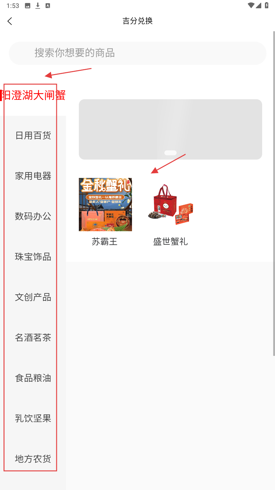2、在【吉分兑换】页,选左侧分类如【阳澄湖大闸蟹】找目标商品。