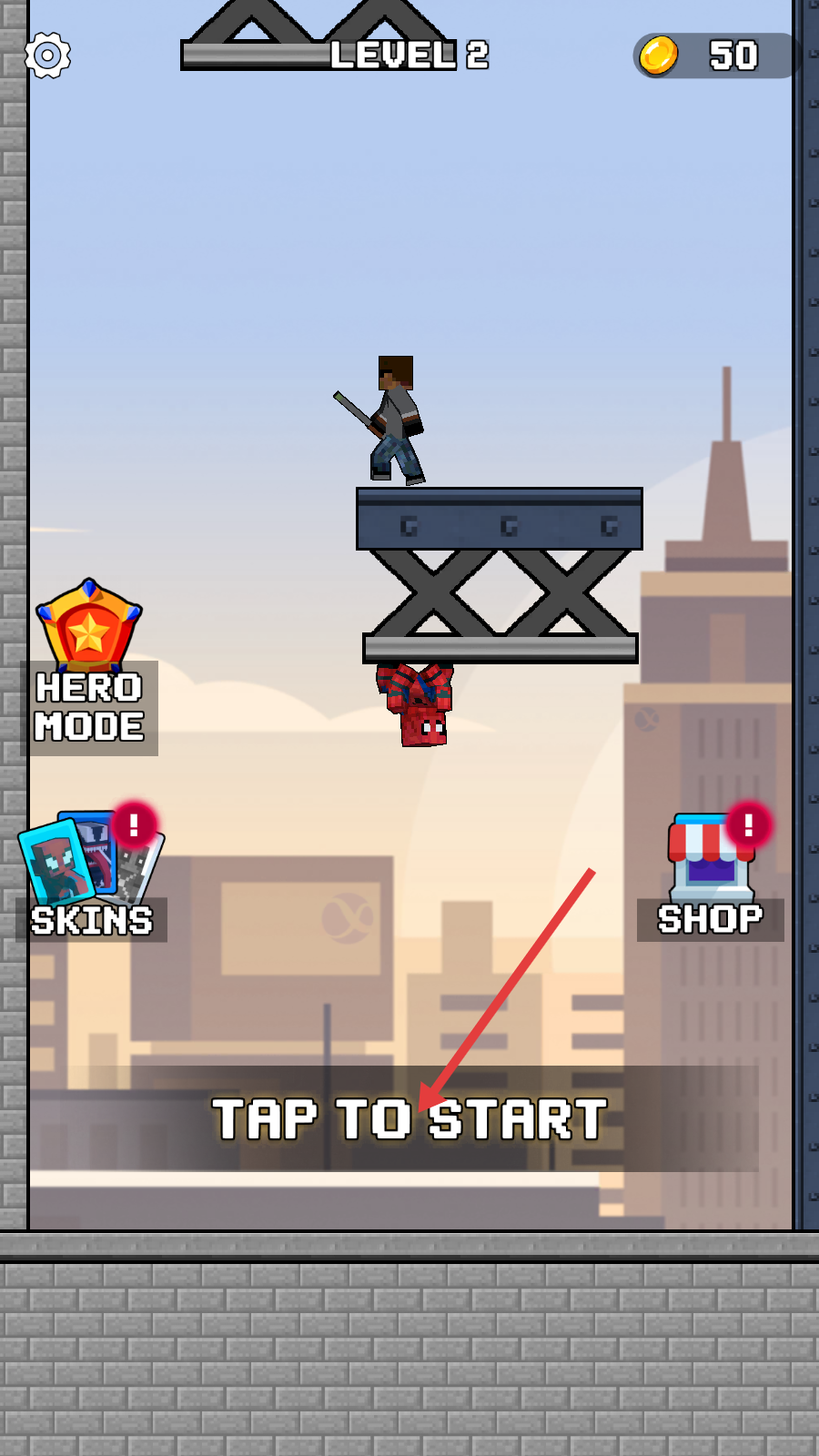 1、点击【TAP-TO-START】开启【LEVEL-2】,熟悉【HERO-MODE】【SKINS】【SHOP】功能,准备迎战敌人。