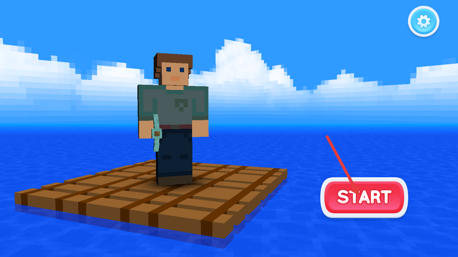 1、点击【START】开启木筏生存,角色立于木筏,海面冒险即刻展开,做好初始准备。