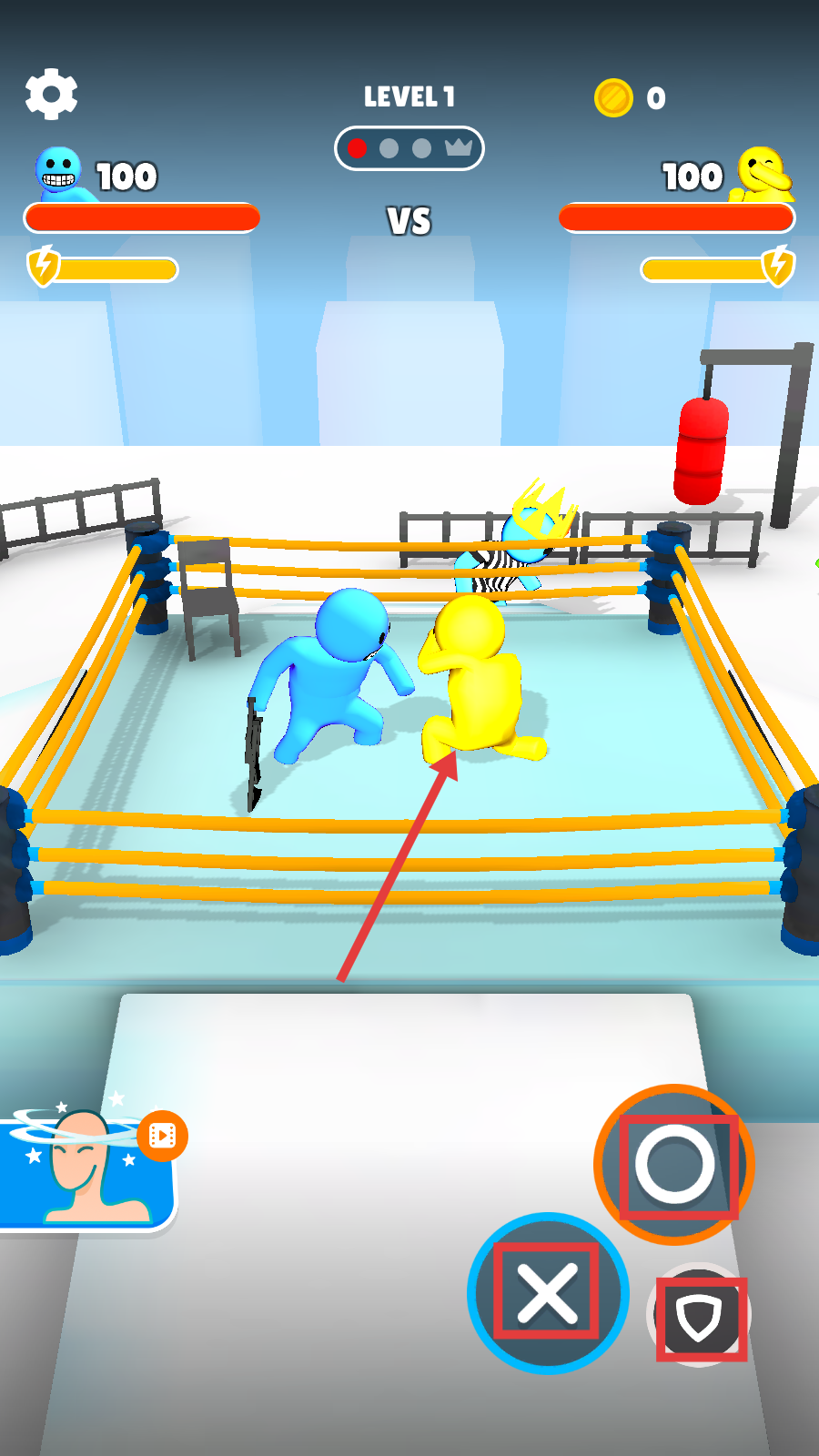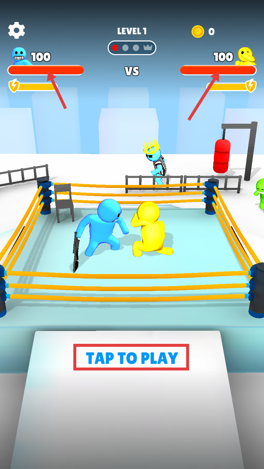 1、进入游戏点击【TAP-TO-PLAY】,开启【LEVEL-1】对决,初始双方血量均为【100】,做好战斗准备。