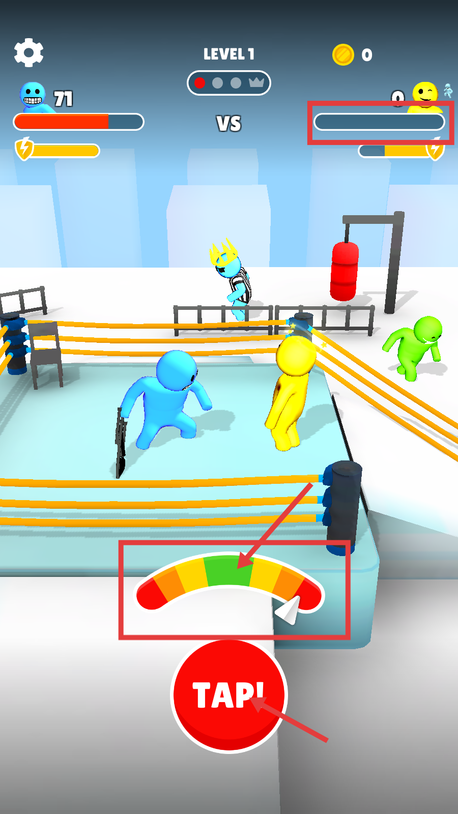 3、出现力度条时点击【TAP】,把控力度区间,精准击败黄色角色。