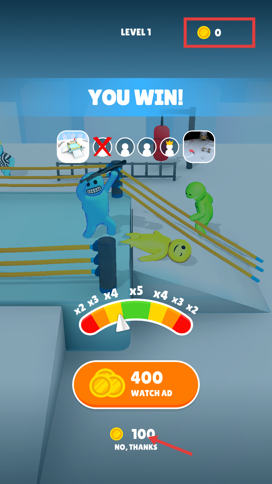 4、胜利后界面显示【YOU-WIN】,选择【100】金币奖励(无需看广告),快速积累资源开启下一关。