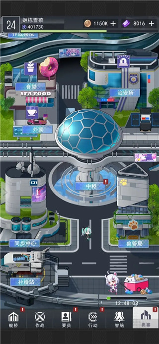 7、要塞的分支玩法特别多,社团就是公会,食堂和外卖分别用来提升角色好感度和日常任务,中枢是核心,闭着眼升级就行了,兽管局是宠物,战斗的时候宠物的技能可以帮忙,同步中心可以让其他角色获得等级最高的五名角色中最低的那位等级的等级,这也是核心机制,位置能多开就多开但是前期没必要花紫石头。