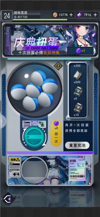 6、庆典扭蛋也是测试福利,不得不说这里面奖励真好啊,每天有很简单的任务获得扭蛋币然后进行扭蛋,抽的差不多还可以重制奖励,香取身集这个角色还是很不错的,后面剧场也可以获得。