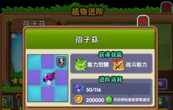 2、这一关的主要攻击植物是孢子菇,因为这一关难度很大,所以要尽量将这种植物升级到四阶。