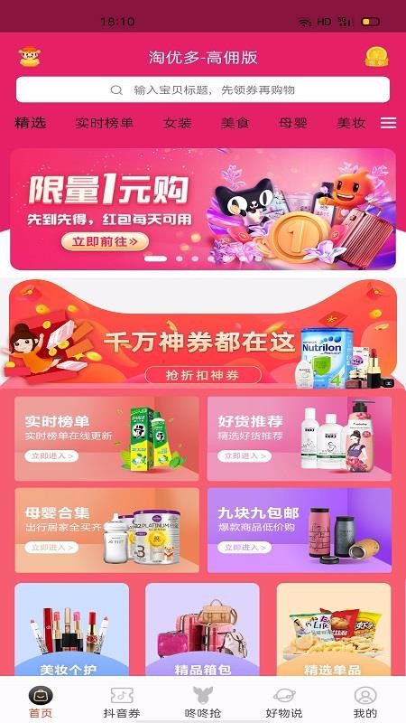 1、提供了超多购物专区,比如美妆个护、精选单品、母婴合集等,方便用户筛选商品进行购买。