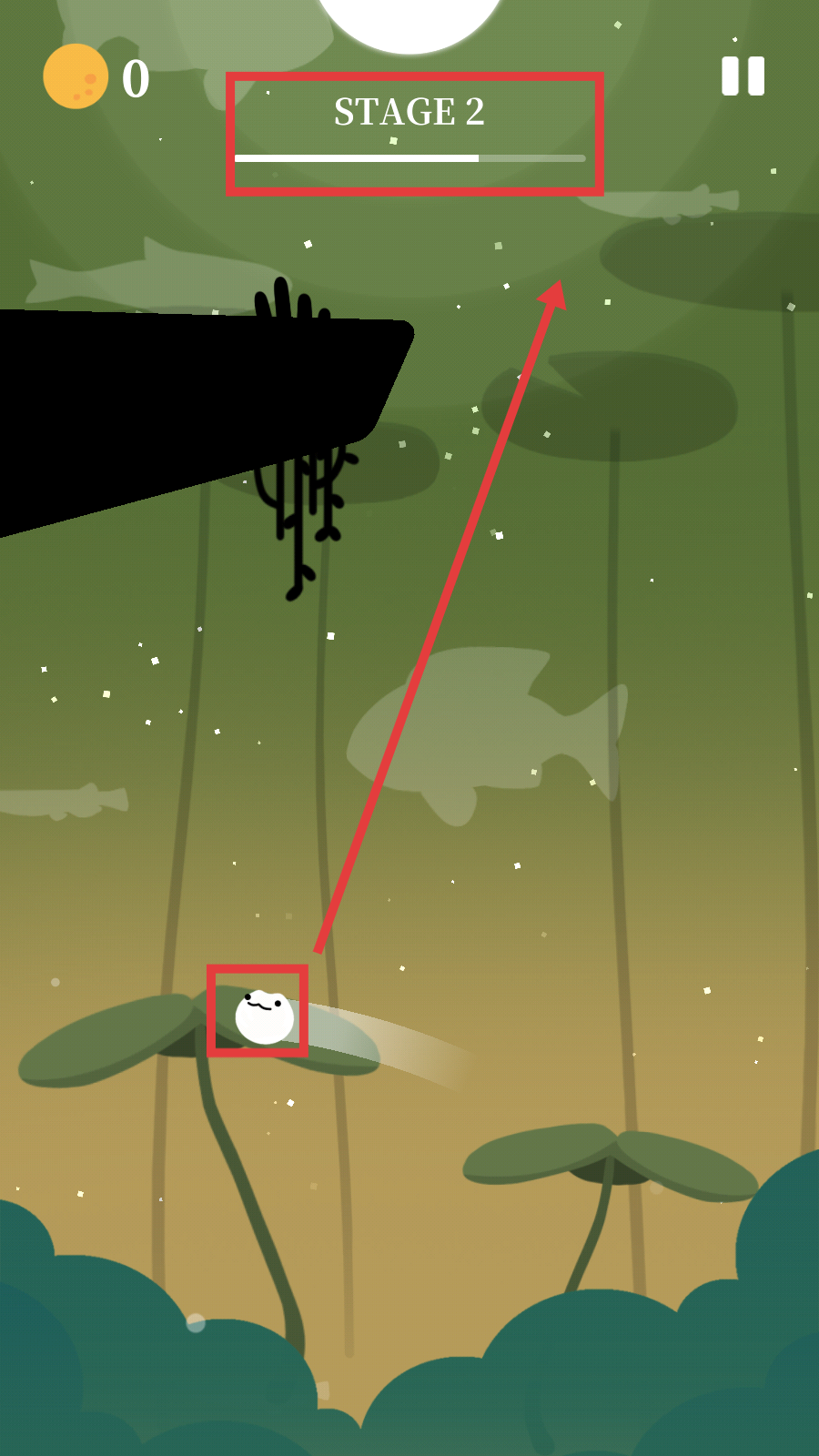3、操控青蛙在荷叶间移动,朝着【STAGE-2】进度条方向前进,逐步完成关卡内的推进任务。