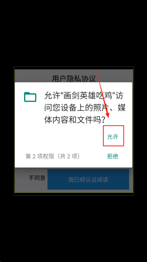 1、授权存储权限:当系统弹出“允许画剑英雄吃鸡访问照片、媒体内容和文件吗?”时,点击“允许”完成第一步授权。