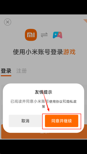 4、登录小米账号:选择“使用小米账号登录游戏”,勾选协议后点击“同意并继续”,成功登录即可开始游戏。
