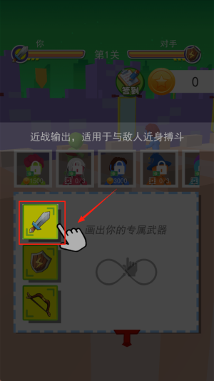 3、绘制专属武器:在“近战输出,适用于与敌人近身搏斗,画出你的专属武器”界面,用手指在屏幕上画出武器即可。