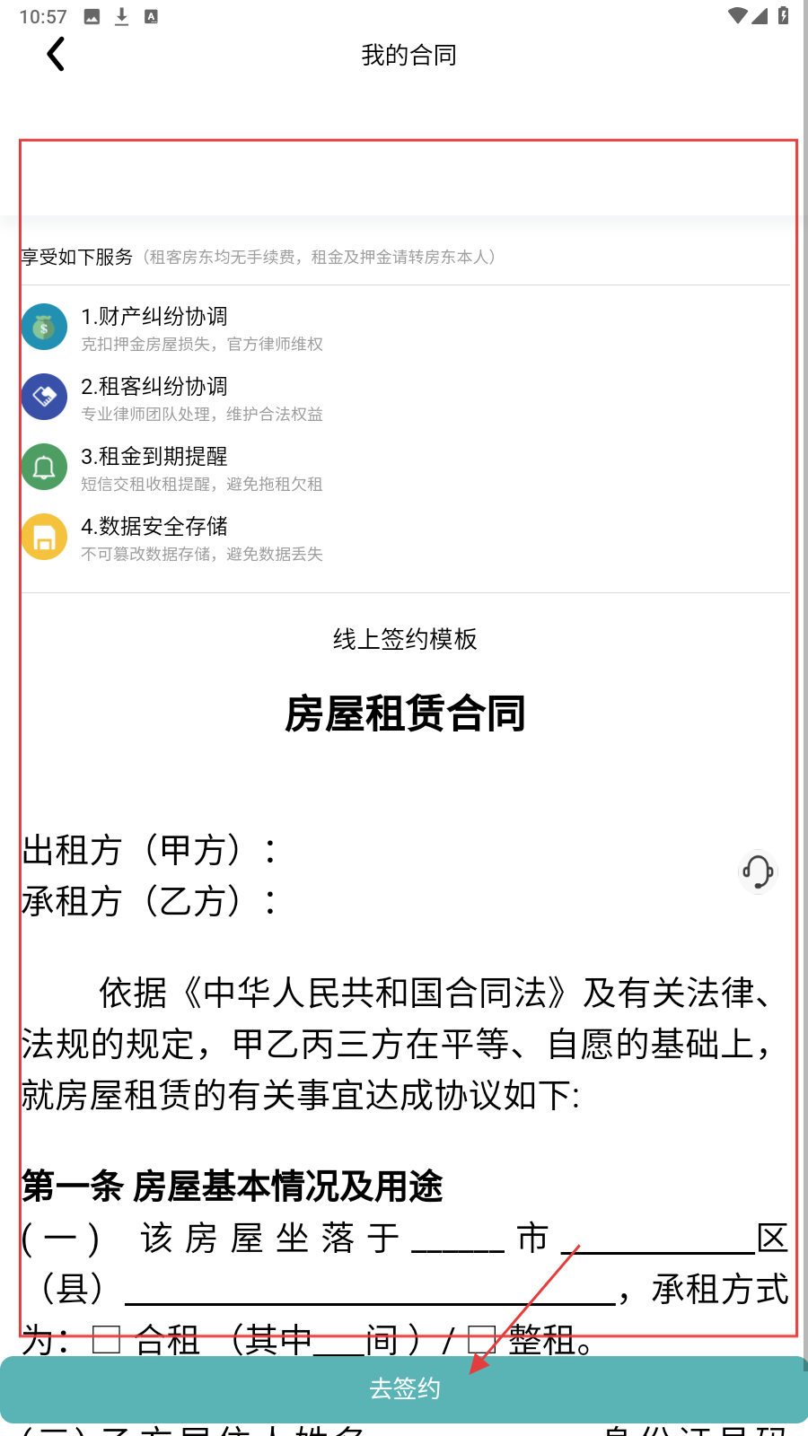 4、进入【我的合同】页面,认真查看合同信息,确认无误后,点击【去签约】即可。
