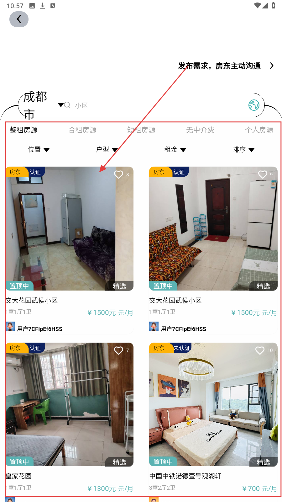 2、在房源筛选页面,可以在上方进行筛选,选择心仪的房源并点击。