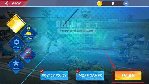 4、启动游戏:在出现“BACK、TRANSFORM、PLAY”等按钮的主界面,点击“PLAY”即可开始游戏,若想了解更多游戏可点“MORE GAMES”。