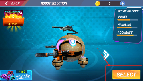 1、挑选机器人:在“ROBOT SELECTION”界面查看“POWER、HANDLING、ACCURACY”数值,选好型号后点击“SELECT”确认出战。