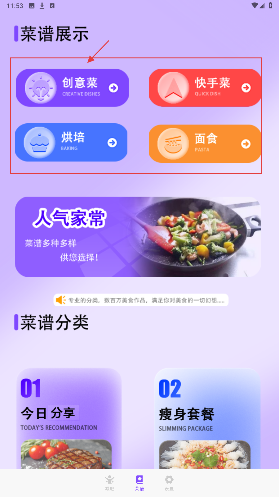 3、到【菜谱】页,选【创意菜】【快手菜】等分类,按需探索特色菜谱。