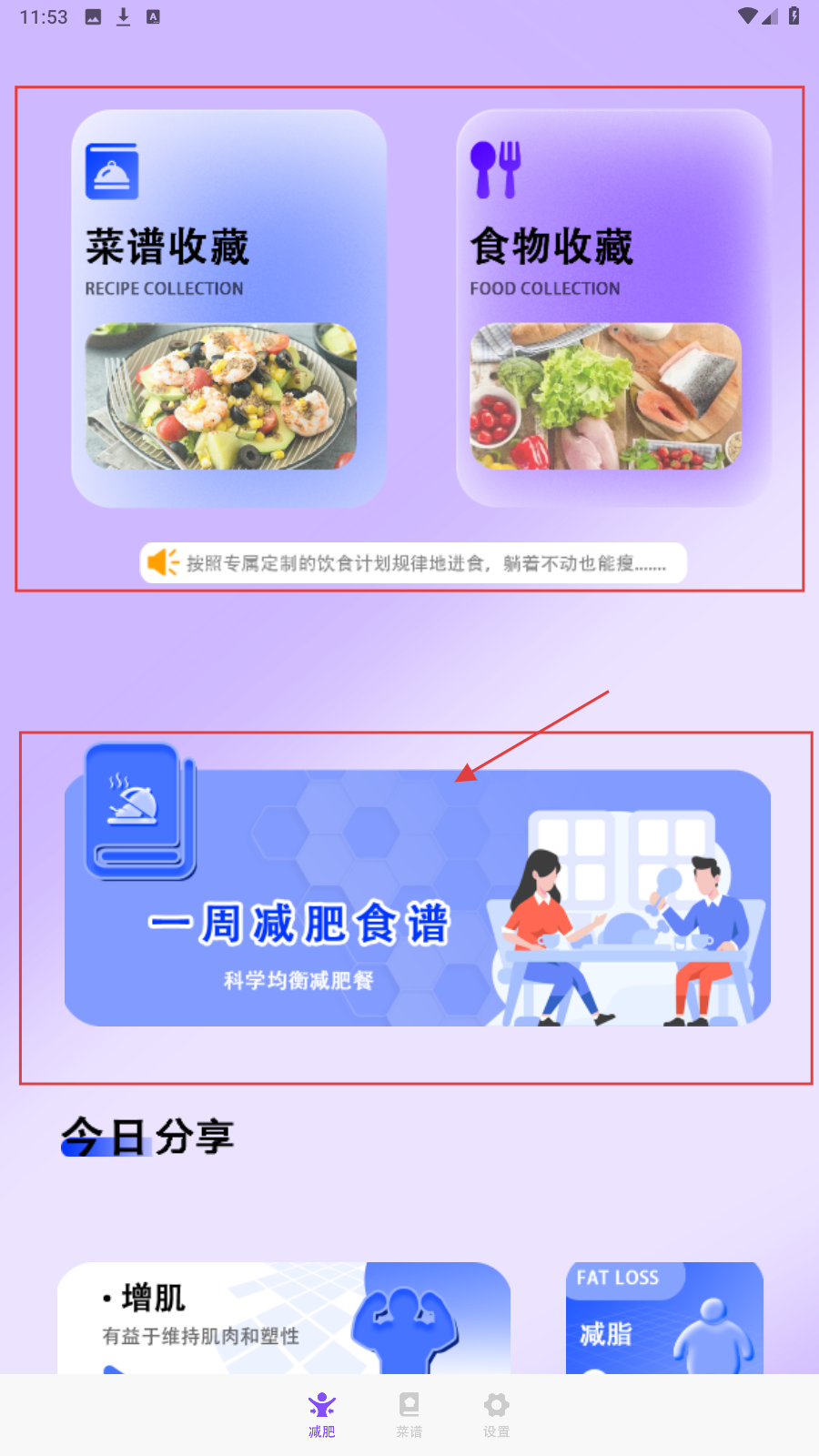 1、在【减肥】页,点【一周减肥食谱】,获取科学均衡的减重饮食计划。