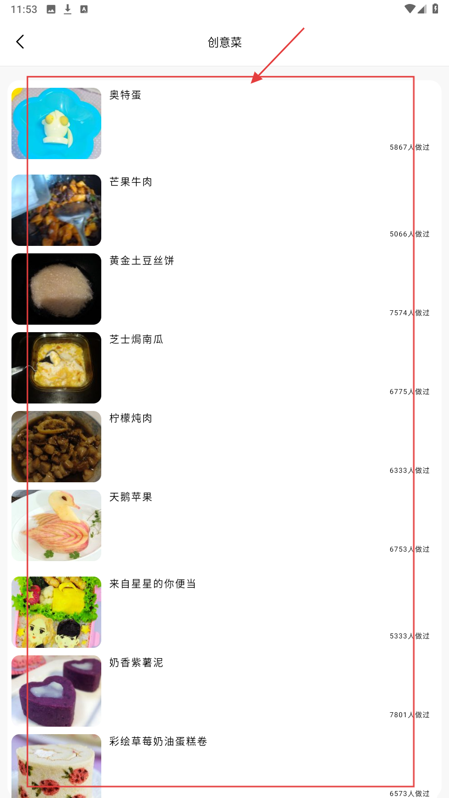 4、进入【创意菜】列表,有奥特蛋、芒果牛肉等菜品,点击可查看做法。