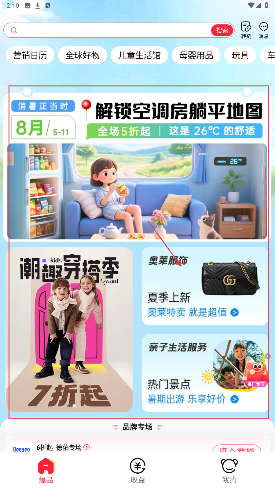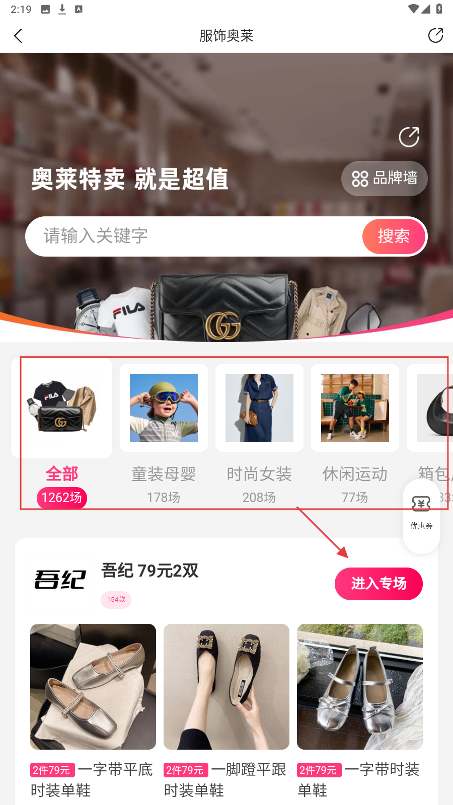 2、在【服饰奥莱】页,选分类(如童装母婴等),或点【进入专场】。