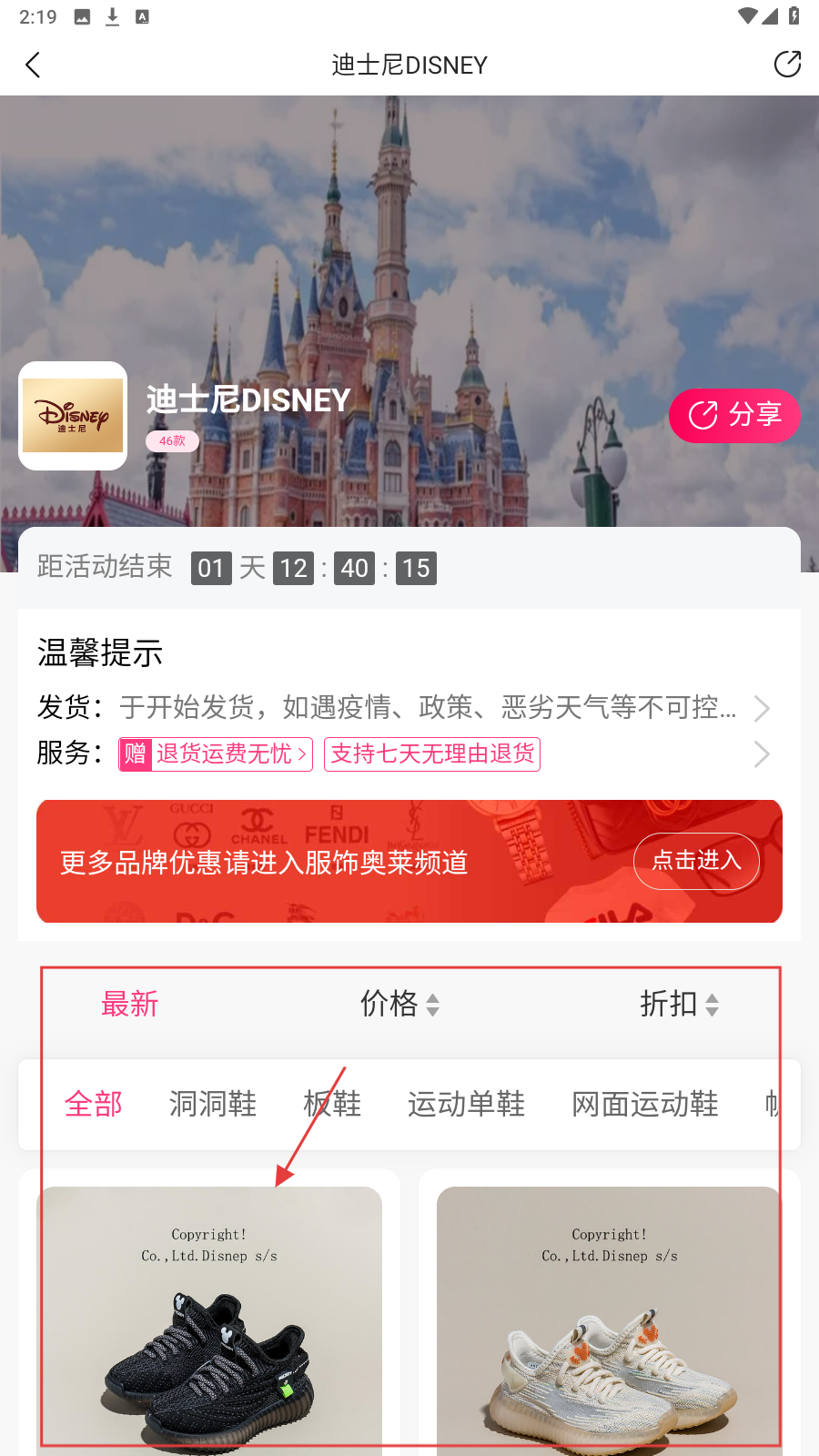 3、进入品牌专场(如迪士尼),筛选商品类型(洞洞鞋等)找心仪商品。