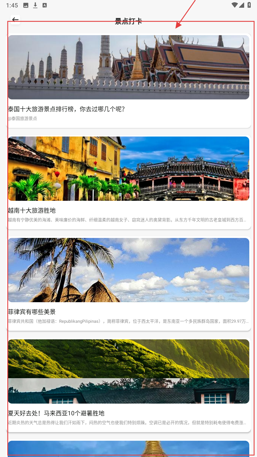 2、点【景点打卡】的“查看更多”,浏览泰国、越南等境外景点推荐。