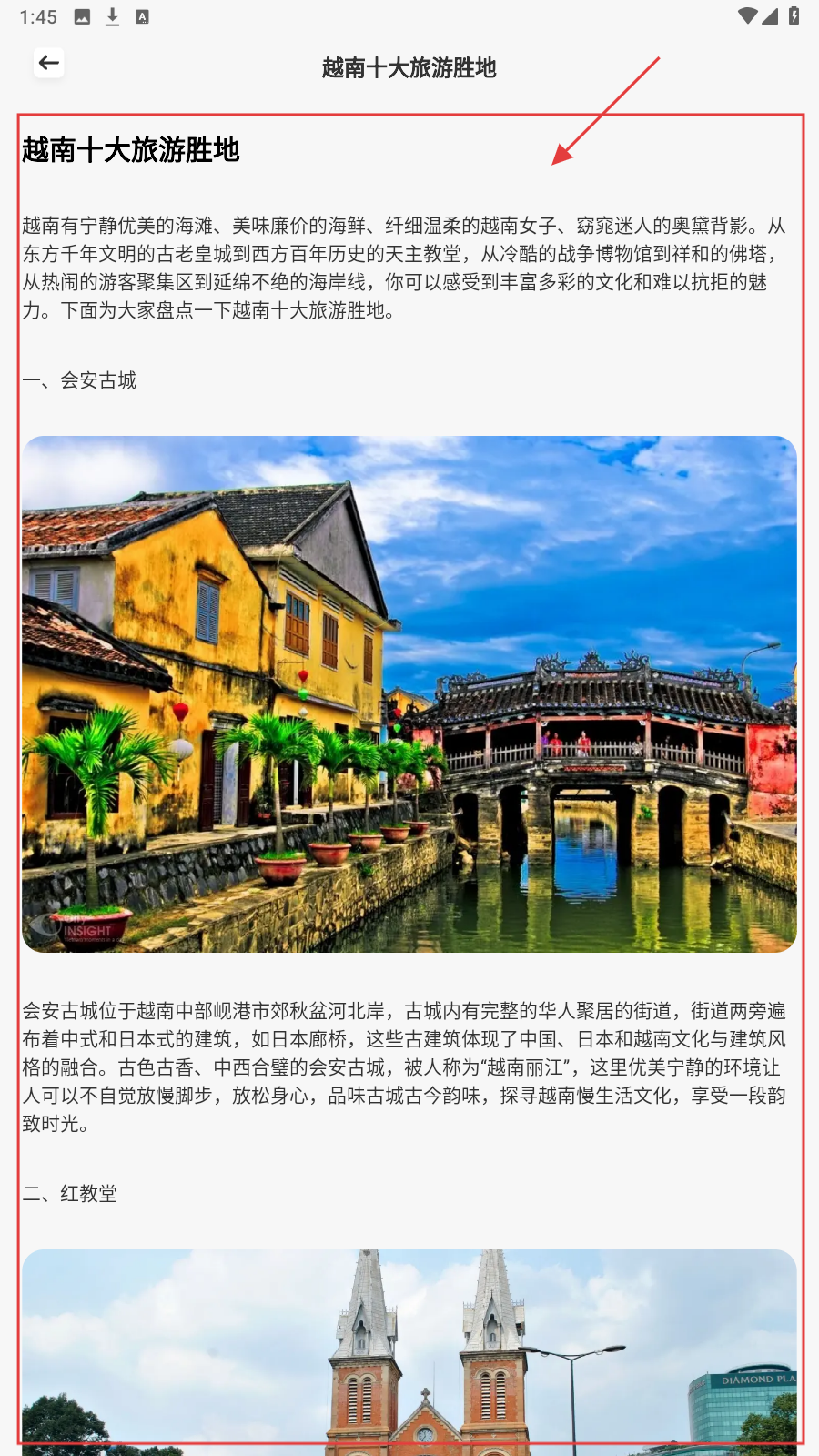 3、选感兴趣的境外景点(如越南十大旅游胜地),查看会安古城、红教堂等介绍。