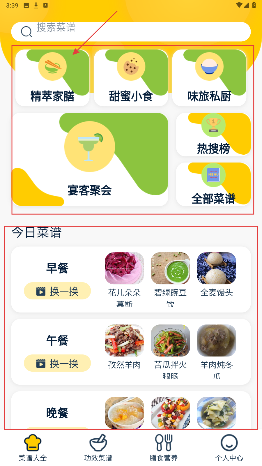 1、进入菜谱界面,点击【精萃家膳】分类,可浏览特色家常菜品,开启选菜第一步。