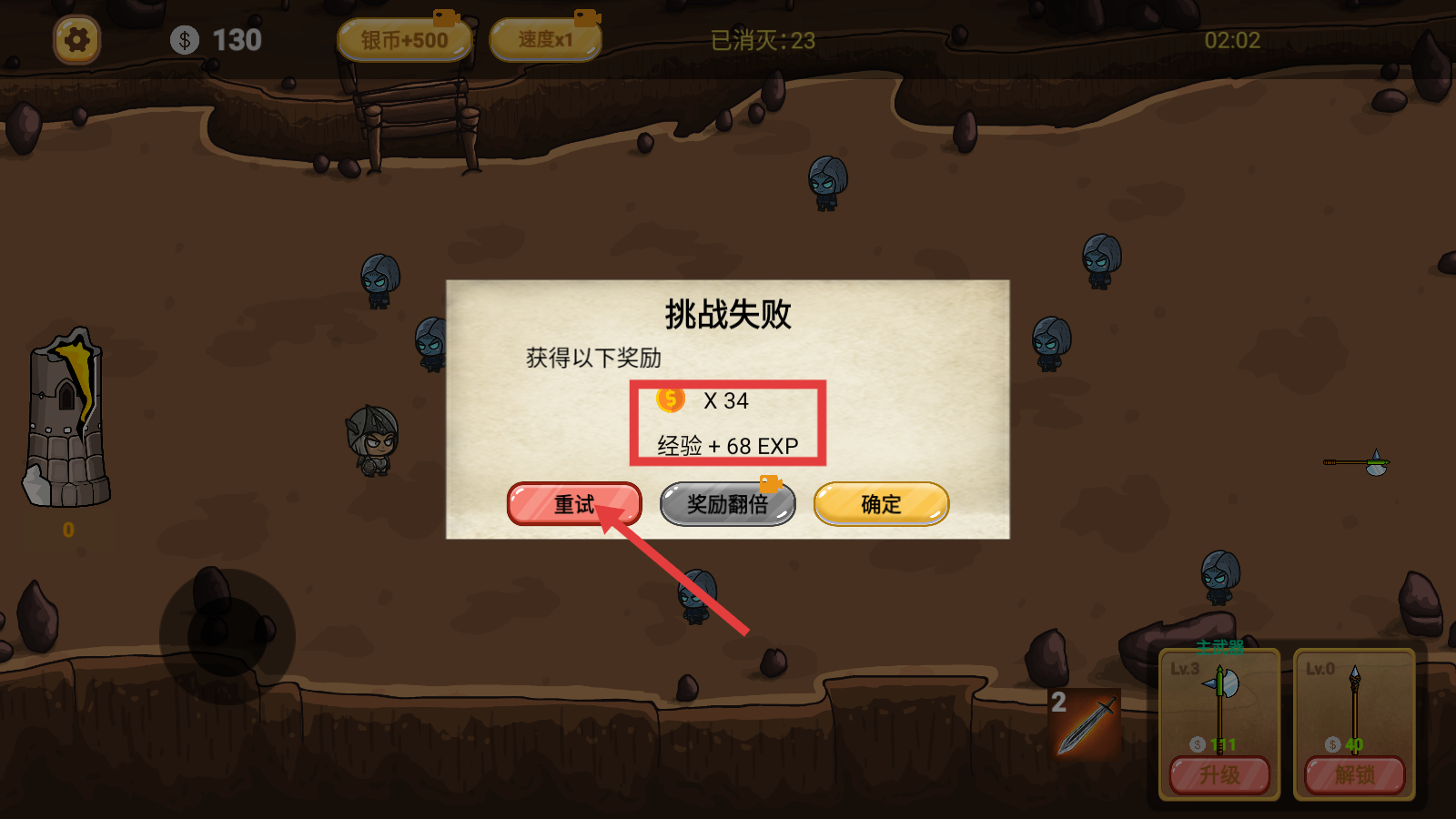 4、挑战失败后可获得【$34】-【经验 68-EXP】,点击【重试】按钮重新挑战或【确定】领取奖励。