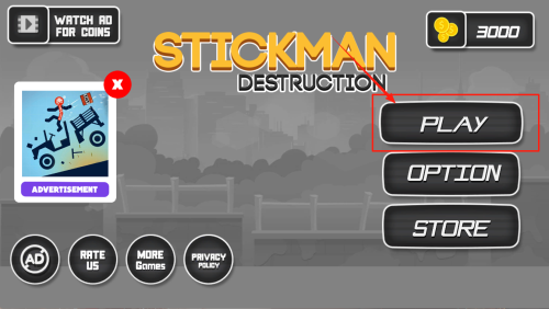 3、领取奖励并进入主菜单:点击“WATCH AD FOR COINS”后,按“PLAY”直接进入游戏主界面。