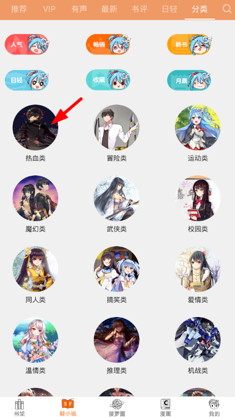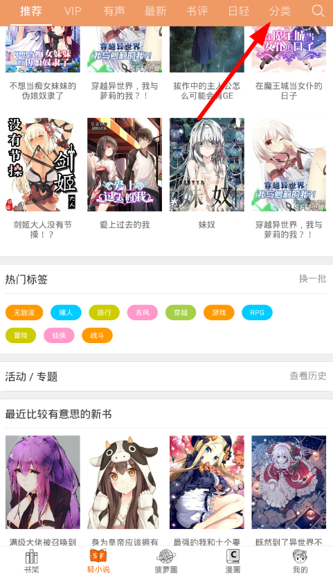 如果想在菠萝包轻小说里查看小说分类,可以通过上方的“分类”选项来查找小说。