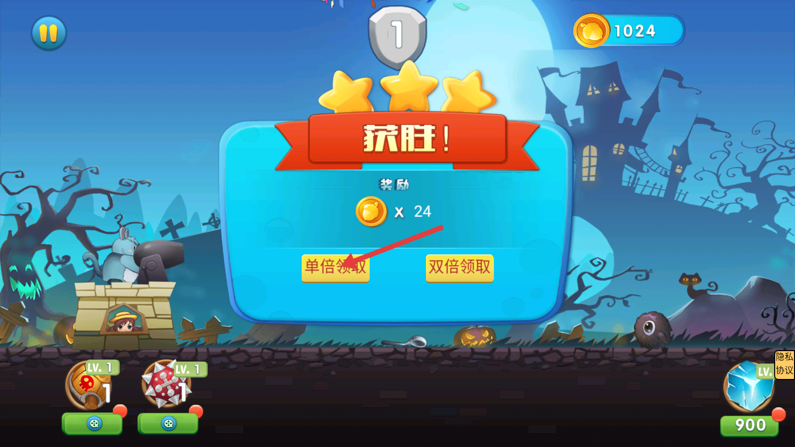 4、获胜后点击【单倍领取】或【双倍领取】获取【24】金币奖励,积累资源用于后续关卡挑战。