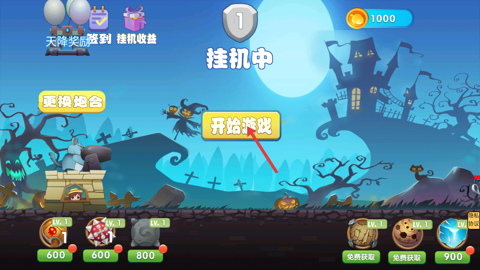 1、进入游戏点击【开始游戏】,利用【挂机收益】积攒资源,也可点击【更换炮台】提前调整装备。