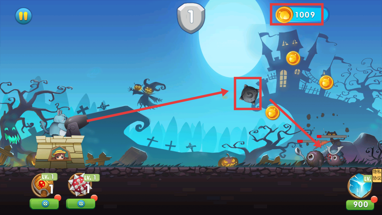 3、战斗时瞄准怪物发射炮弹,击中后获取【金币】,积累到【1009】可用于升级炮台或解锁道具。
