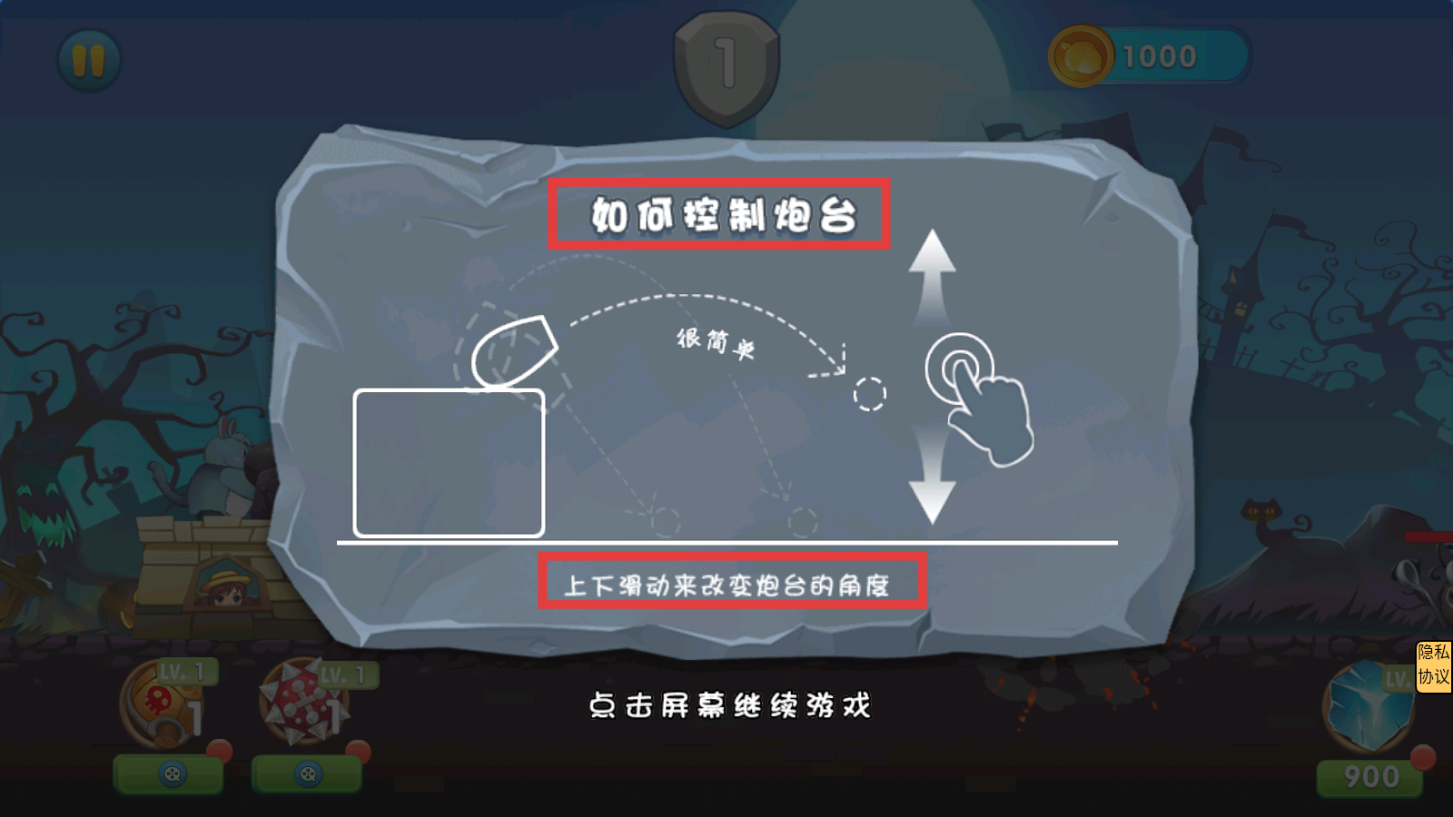 2、学习【如何控制炮台】,通过上下滑动屏幕改变炮台角度,调整后点击屏幕继续游戏。