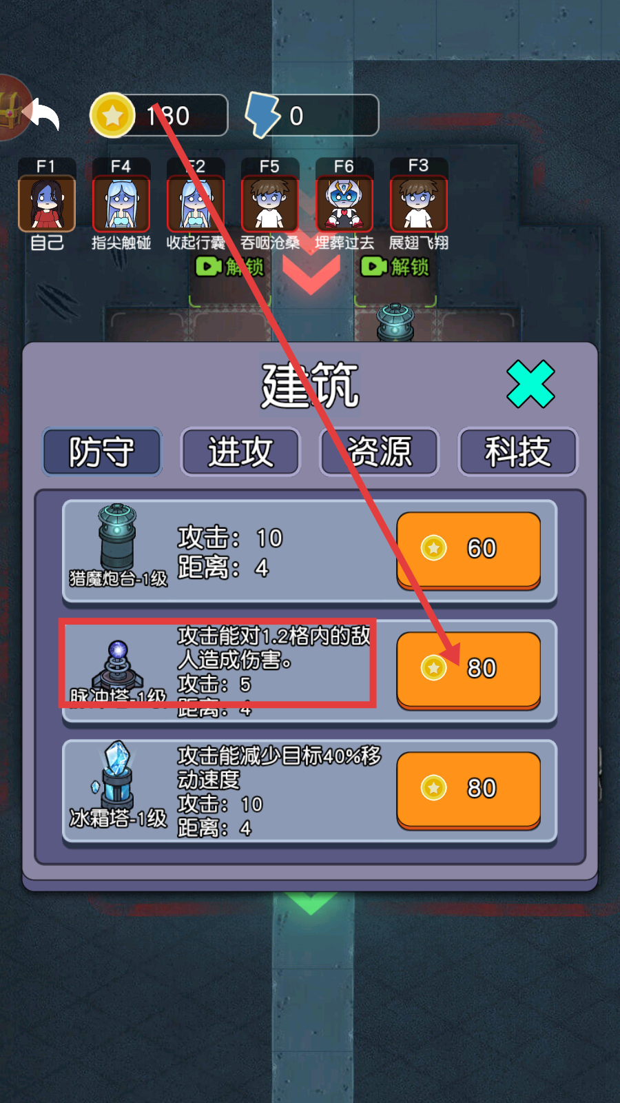 3、打开【建筑】界面,花费【80】金币升级【脉冲塔-1级】,其可对1.2格内敌人造成伤害,增强防御。