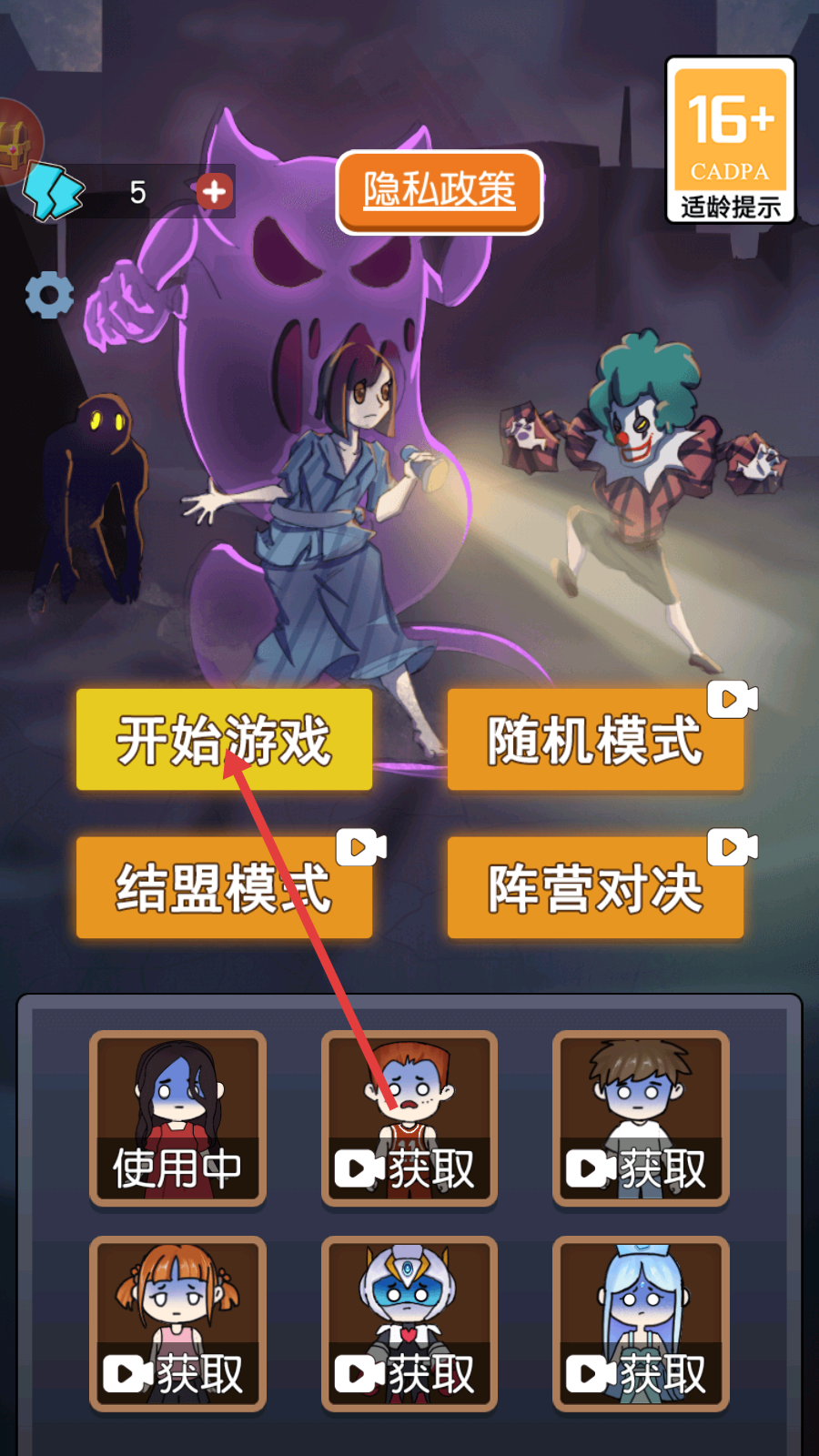 1、进入游戏先点击【开始游戏】,可选【随机模式】等玩法,部分角色需看视频【获取】解锁使用。