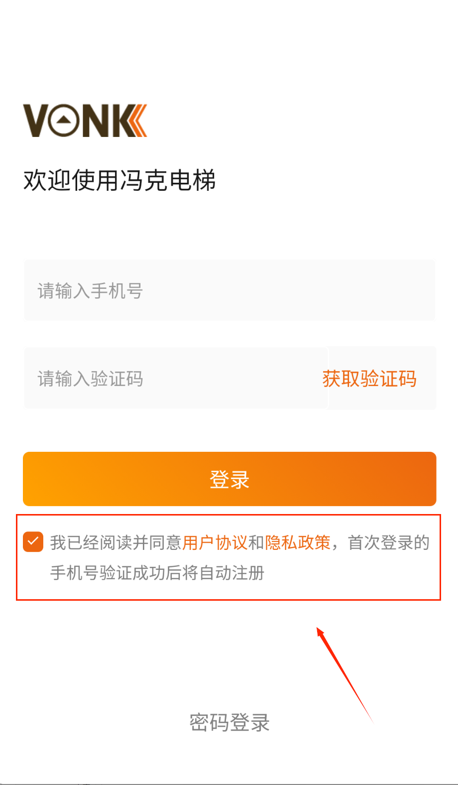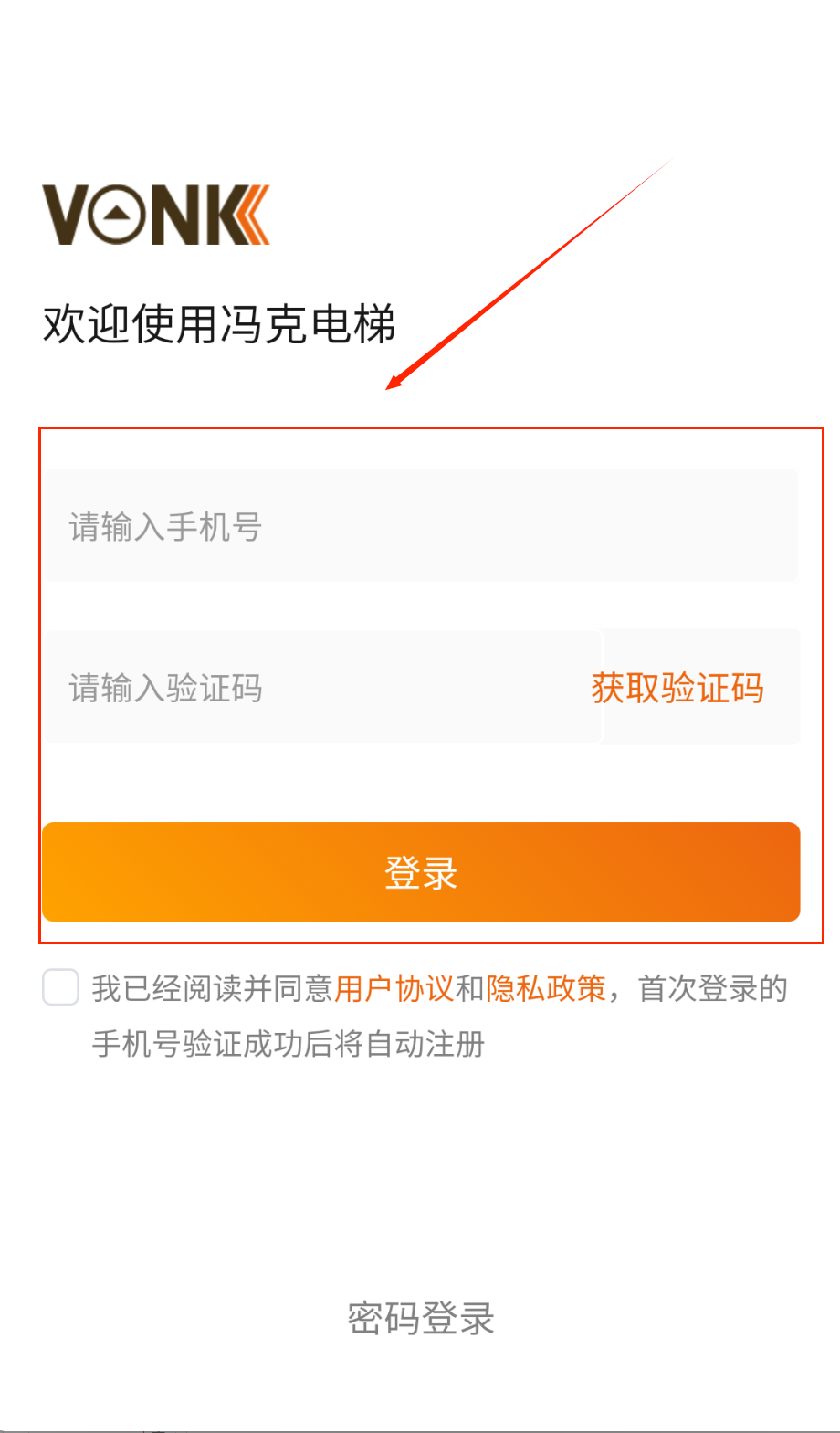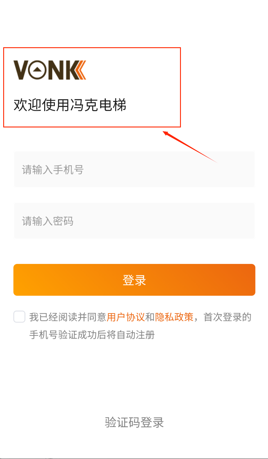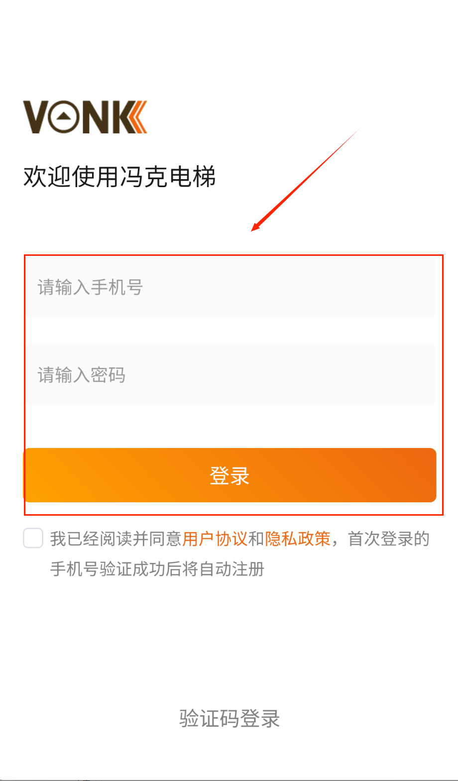 1、打开APP进入登录页,顶部显示时间状态,中间是"欢迎使用冯克电梯"欢迎语呀。第一个输入框填写11位手机号,注意不要输错哦。