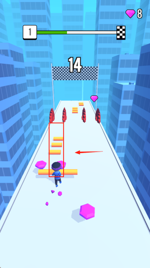 3、收集金币升级:在跑酷或比赛中捡拾金币,用金币提升自身实力,升级棍子增强消除障碍能力,为后续挑战蓄力。