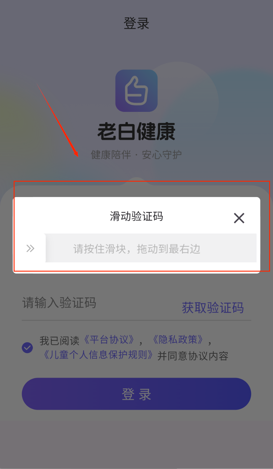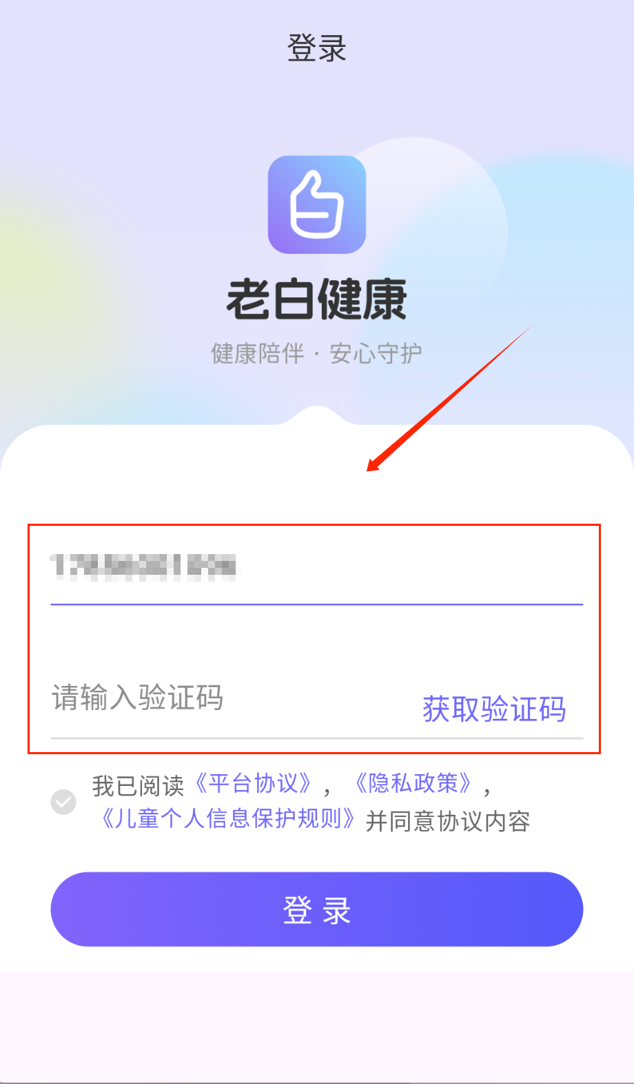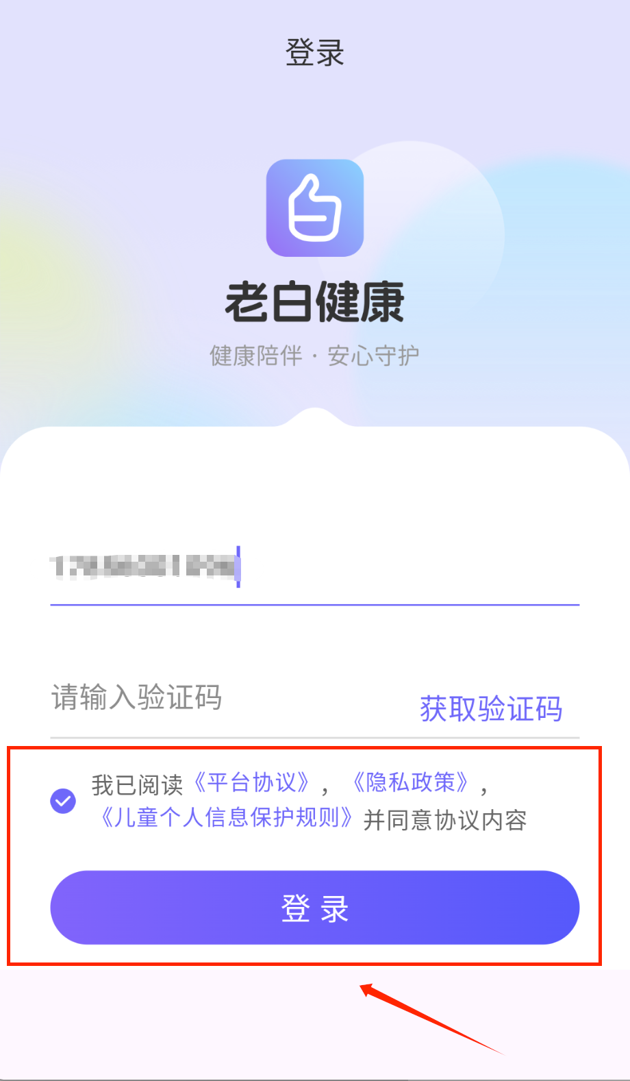 1、打开APP进入登录页,顶部显示时间状态,中间是老白健康logo和健康陪伴·安心守护标语呀。输入11位手机号获取验证码哦。