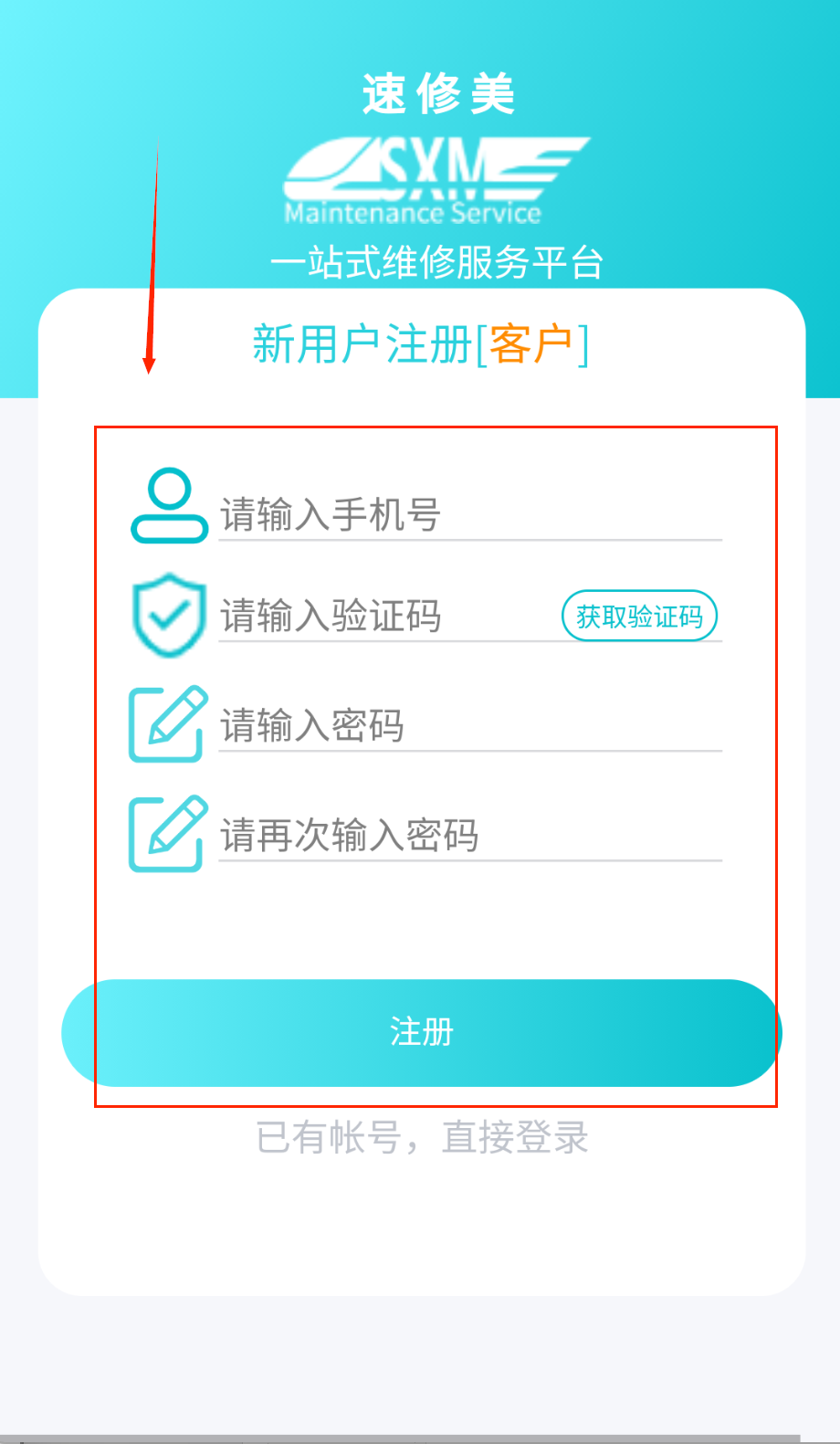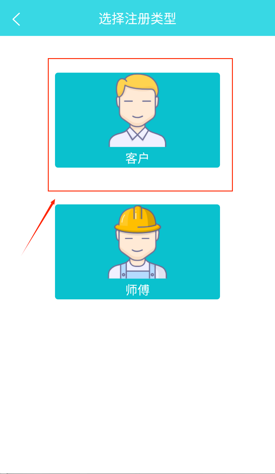 2、注册需选择用户类型,客户选衬衫图标,维修师傅选安全帽图标。填写11位手机号获取6位验证码,注意查收短信啦。
