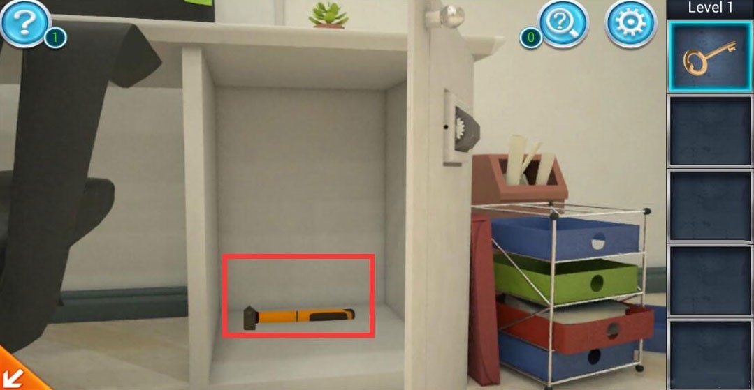 4、点击门的左侧架子,用锤子将小猪存钱罐摆脱,可得到钱币。