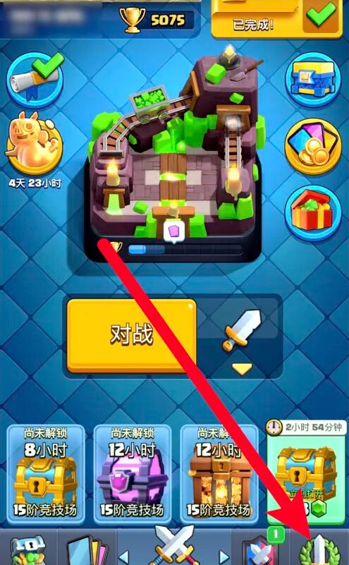 1、打开皇室战争游戏界面, 点击右下角的战斗的图标。