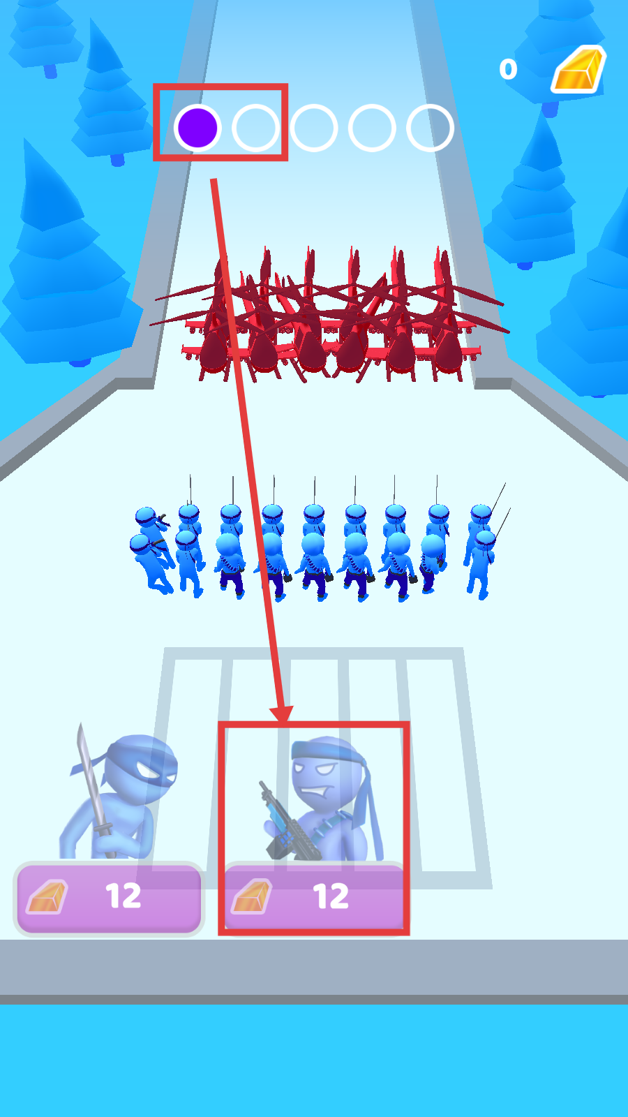 3、推进过程中填充上方圆圈进度,解锁持枪的蓝色强化小人,借助新单位提升队伍的攻击能力。