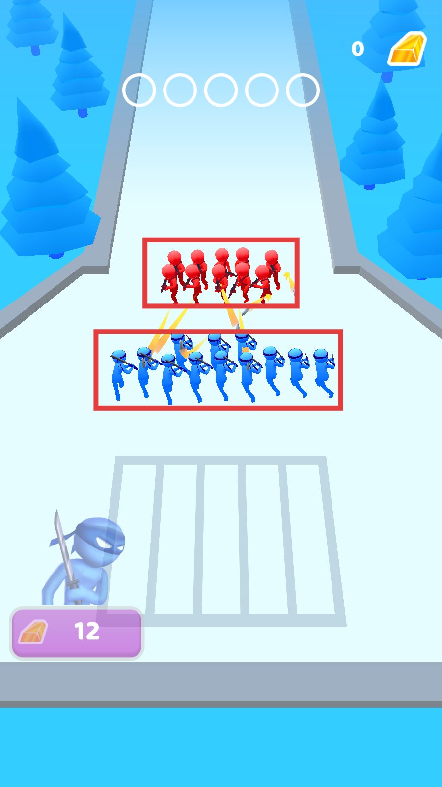 2、遭遇红方小人时,利用己方蓝色小人的数量优势发起进攻,通过对冲消耗敌方战力,争取战斗胜利。
