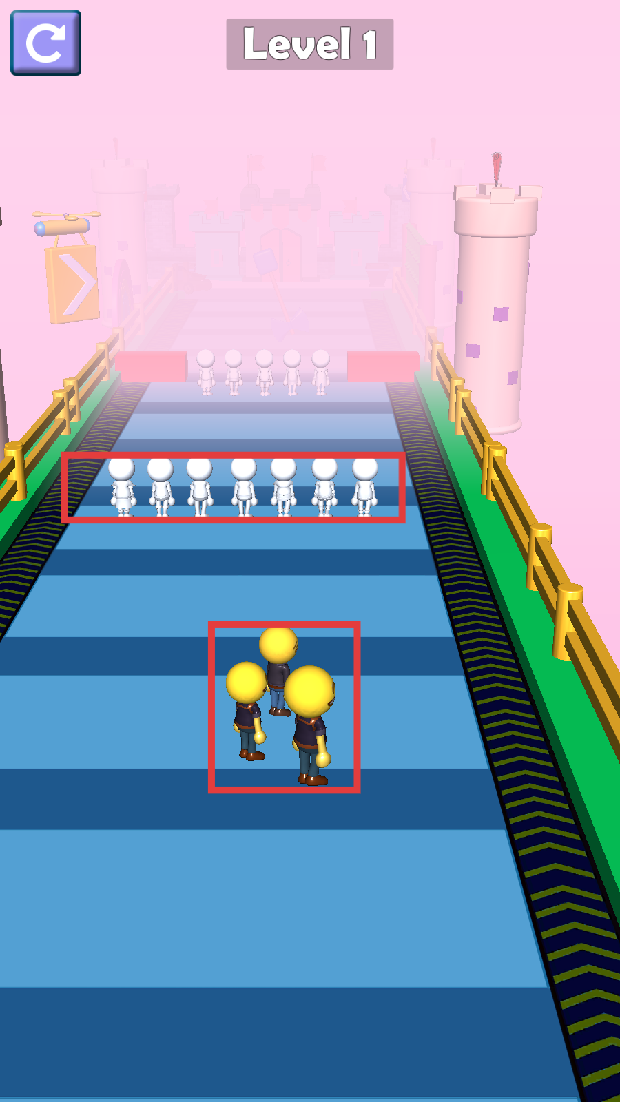 2、行进中靠近黄色小人并纳入队伍,壮大势力,同时避开白色小人阻碍,保持队伍移动方向。