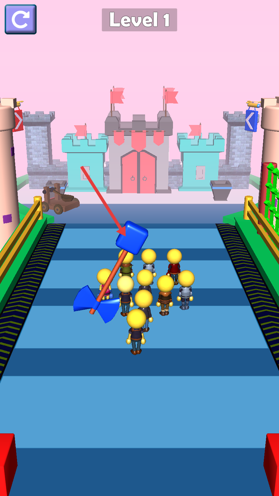 3、遇到【蓝色锤子】道具时靠近获取,利用它清除路径阻碍,带领队伍顺利抵达城堡区域。