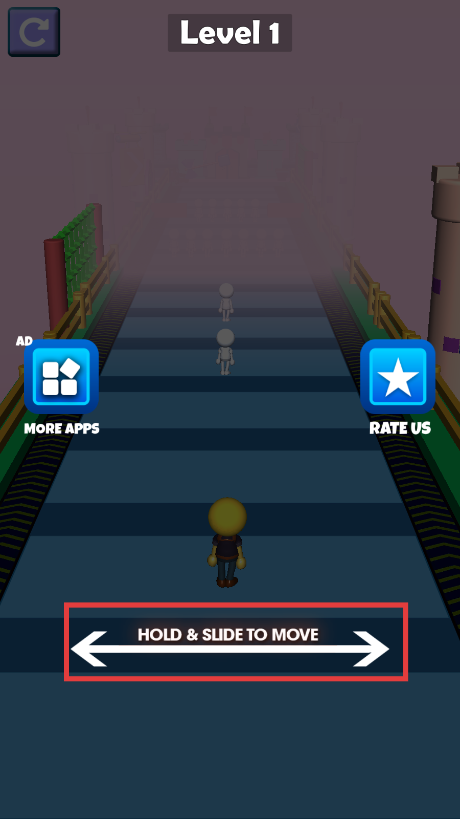 1、进入【Level-1】后,按【HOLD-&-SLIDE-TO-MOVE】提示滑动屏幕,控制角色左右移动向前推进。