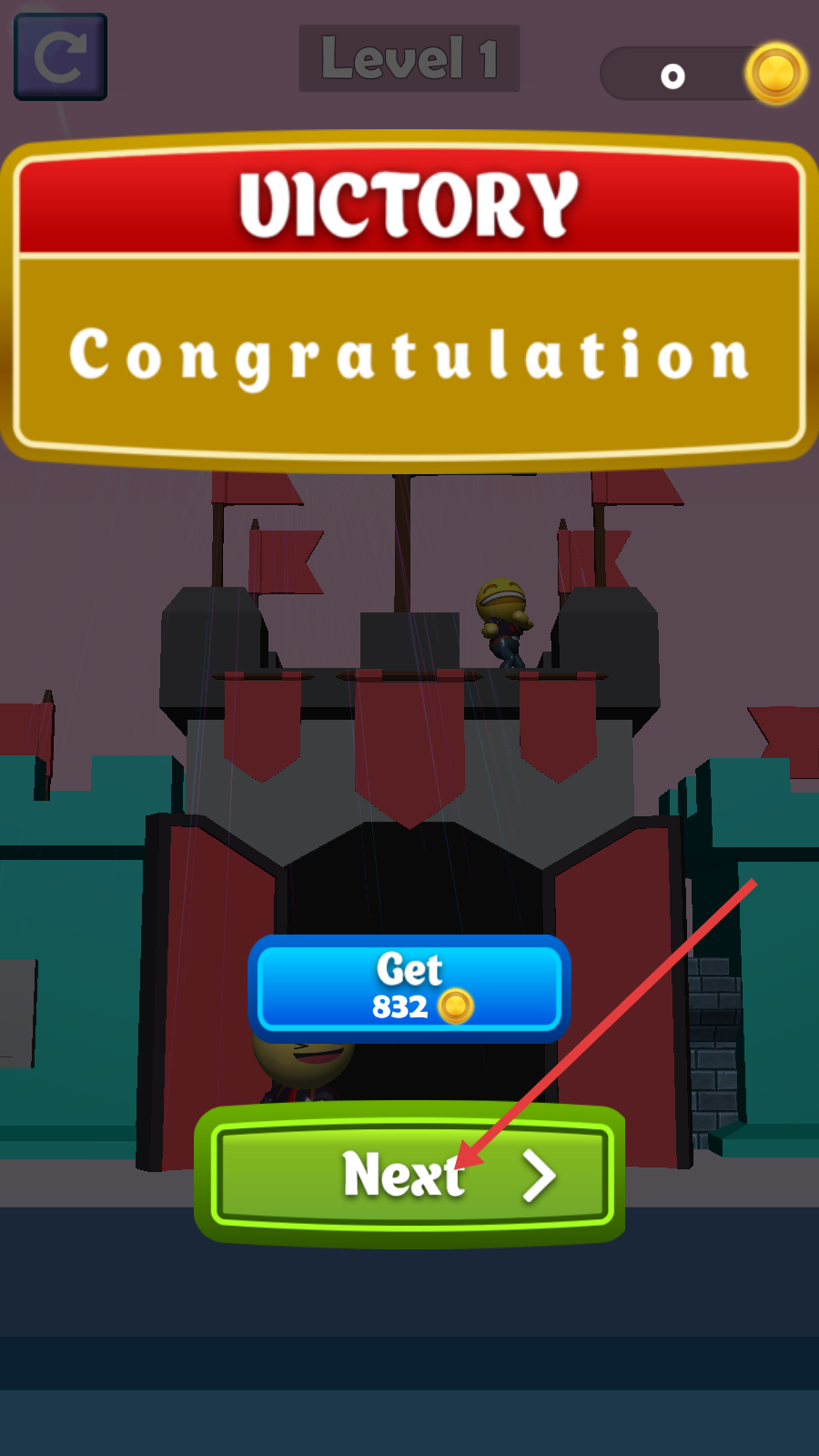 4、通关后点击【Get-832】领金币奖励,再按【Next】按钮进入下一关继续挑战新内容。