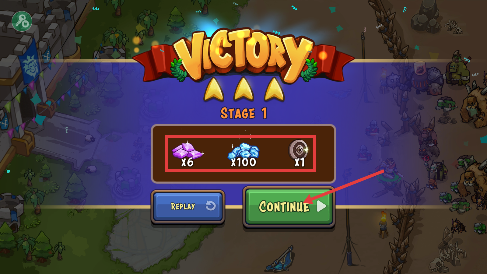 4、通关【Stage-1】后,领取【x6】紫晶、【x100】蓝晶等奖励,点击【CONTINUE】继续挑战。