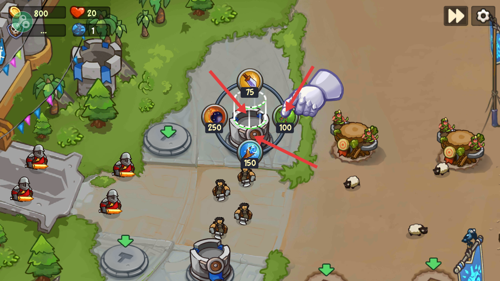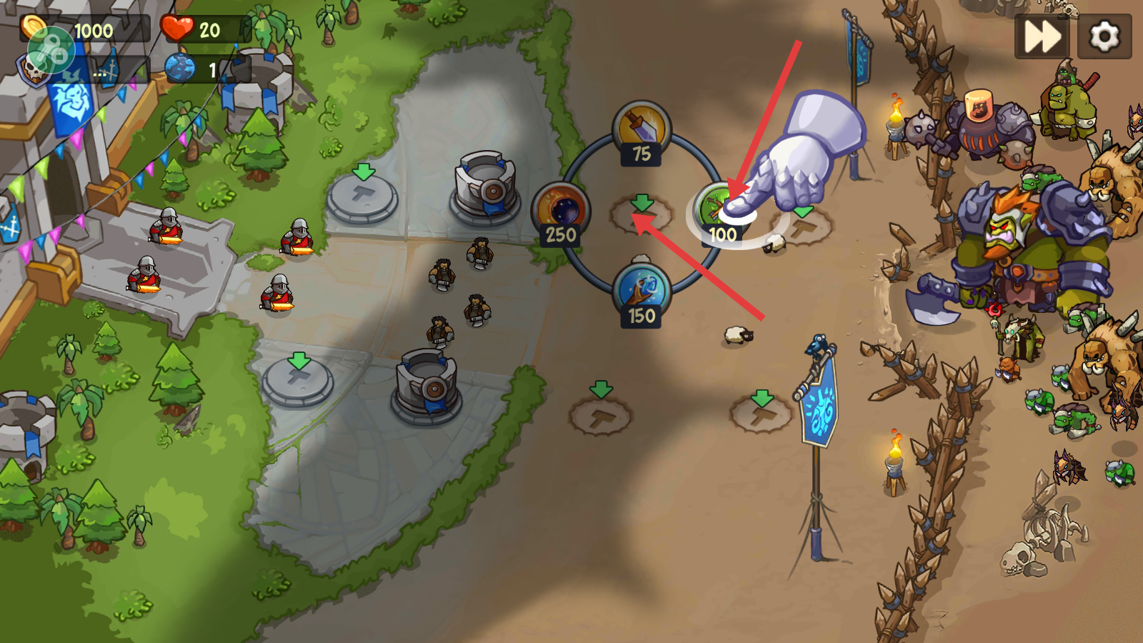 2、进入关卡后,消耗【100】资源点击对应图标,在空地放置防御单位,初步构建防御阵线。